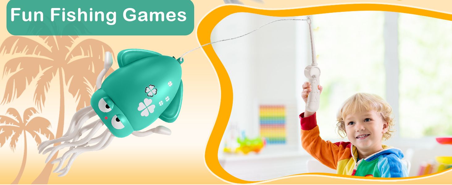 - ❤ Fun Fishing Rod Game ❤ This interactive playset includes a detachable fishing rod that lets little ones "catch" the dancing octopus and take it on imaginative adventures! Engages infants during crucial developmental tummy time! Our squid tummy time toy encourages neck/back muscle growth.